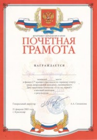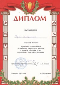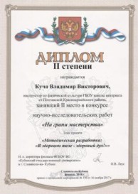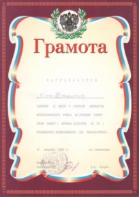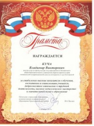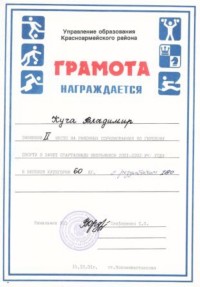 Ф.И.О.: Куча Владимир Викторович. Должность: инструктор физической культуры. Образование: Государственный педагогический институт г. Славянска-на-Кубани. Специальность по диплому: физическая культура. Педагогический стаж: 4 года. Квалификационная категория: соответствие занимаемой должности. Тема самообразования: «Количественные характеристики тренировочной нагрузки гиревиков в двухмесячном цикле подготовительного периода». |
