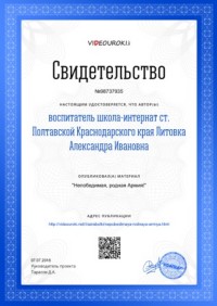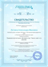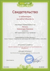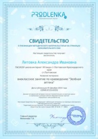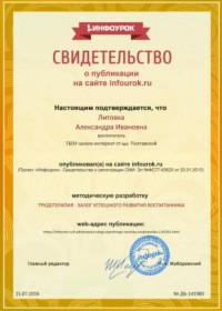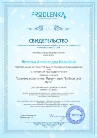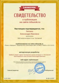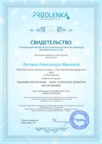 Ф.И.О.: Литовка Александра Ивановна. Должность: воспитатель. Образование: Ленинградское педагогическое училище Краснодарского края. Специальность по диплому: дошкольное воспитание. Педагогический стаж: 37 лет. Квалификационная категория: соответствие занимаемой должности. Тема самообразования: «Нравственное воспитание детей с ОВЗ». |