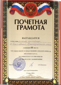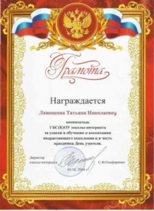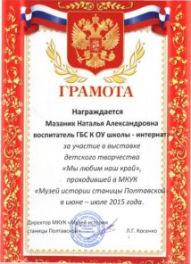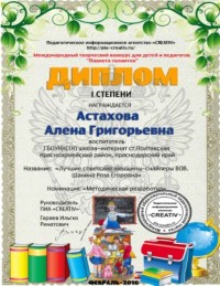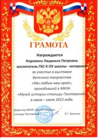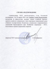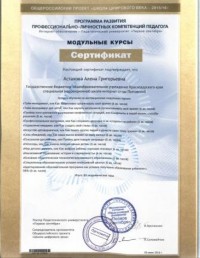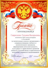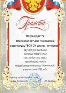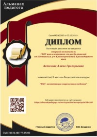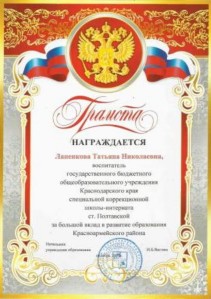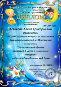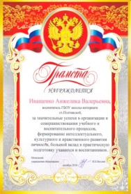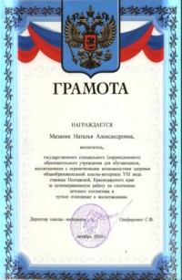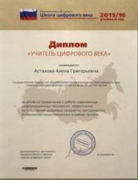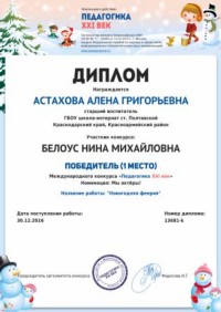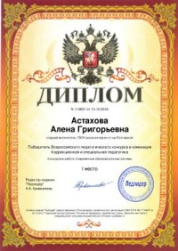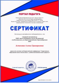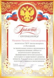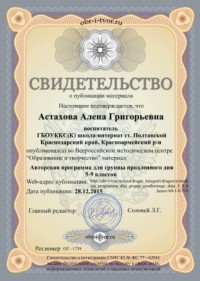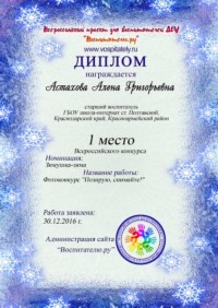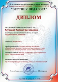 Ф.И.О.: Астахова Алена Григорьевна. Должность: старший воспитатель. Образование: Армавирский государственный педагогический институт. Специальность по диплому: учитель начальных классов, по специальности «Педагогика и методика начального образования». Педагогический стаж: 17 лет. Квалификационная категория: первая квалификационная категория. Тема самообразования: «Система патриотического воспитания в школе-интернате на основе туризма». |