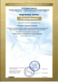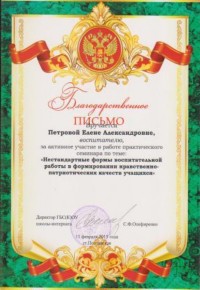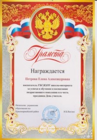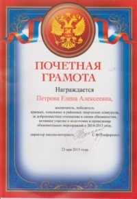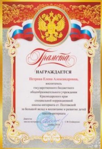 Ф.И.О.: Петрова Елена Александровна. Должность: воспитатель. Образование: Кубанский государственный университет. Специальность по диплому: учитель начальных классов. Педагогический стаж: 27 лет. Квалификационная категория: соответствие занимаемой должности. Тема самообразования: «Воспитание младших школьников». |