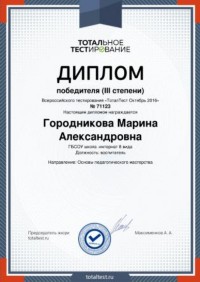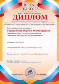 Ф.И.О.: Городникова Марина Александровна. Должность: воспитатель. Образование: Ейское педагогическое училище Краснодарского края. Специальность по диплому: учитель-логопед. Педагогический стаж: 35 лет. Квалификационная категория: первая. Тема самообразования: «Эстетическое воспитание детей с ОВЗ». |