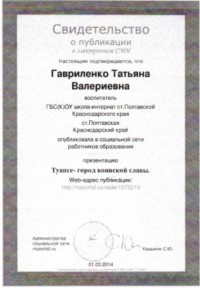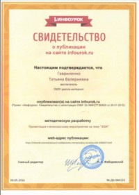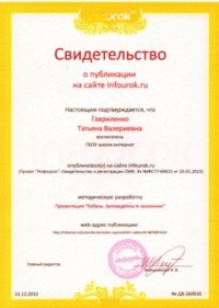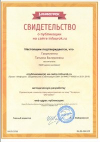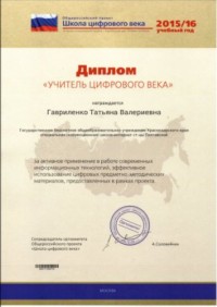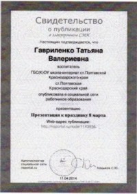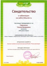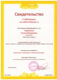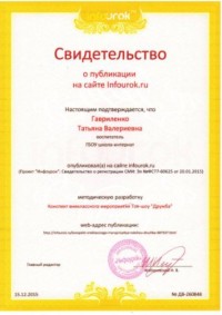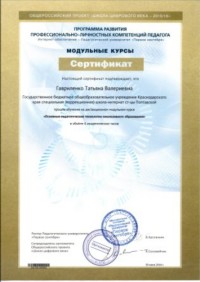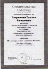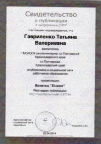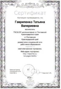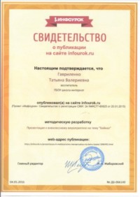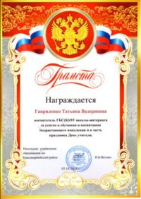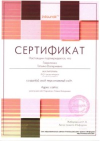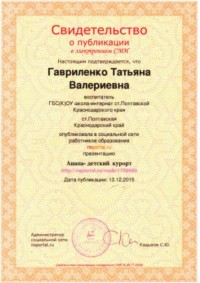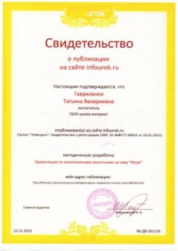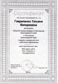 Ф.И.О.: Гавриленко Татьяна Валериевна. Должность: воспитатель. Образование: Ржищевский индустриальный-педагогический техникум. Специальность по диплому: учитель начальных классов. Педагогический стаж: 20 лет. Квалификационная категория: первая. Тема самообразования: «Экологическое воспитание через познавательное развитие». |