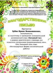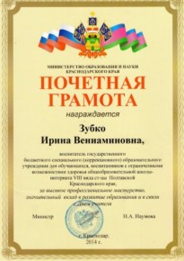 Ф.И.О.: Зубко Ирина Вениаминовна. Должность: воспитатель. Образование: Армавирский государственный педагогический институт. Специальность по диплому: учитель математики средней школы. Педагогический стаж: 44 года. Квалификационная категория: первая. Тема самообразования: «Личностно-ориентированный подход в воспитании». |