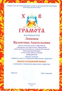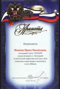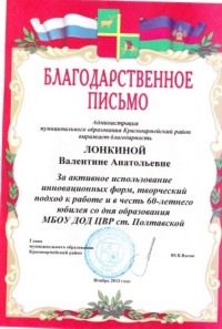 Ф.И.О.: Лонкина Валентина Анатольевна. Должность: воспитатель. Образование: Московский психолого-социальный институт. Специальность по диплому: преподаватель психологии по специальности «Психология». Педагогический стаж: 23 года. Квалификационная категория: соответствие занимаемой должности. Тема самообразования: «Формирование социальной компетентности детей младшего школьного возраста в игровой деятельности». |