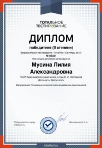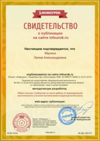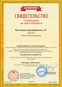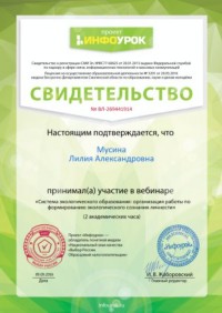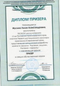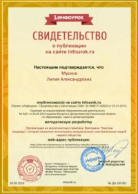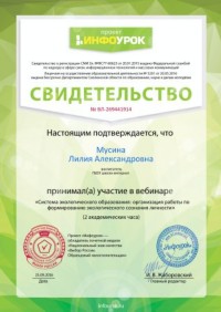 Ф.И.О.: Мусина Лилия Александровна. Должность: воспитатель. Образование: Казанское педагогическое училище; институт инновационных технологий. Специальность по диплому: воспитание в дошкольных учреждениях; олигофрения. Педагогический стаж: 40 лет. Квалификационная категория: высшая. Тема самообразования: «Совершенствование работы по формированию экологической нравственности школьников». |