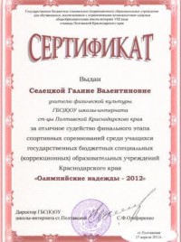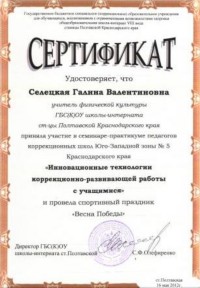 Ф.И.О.: Селецкая Галина Валентиновна. Должность: воспитатель. Образование: Кубанская государственная академия физической культуры. Специальность по диплому: учитель физической культуры. Педагогический стаж: 26 лет. Квалификационная категория: первая. Тема самообразования: «Воспитание нравственных качеств через игру». |