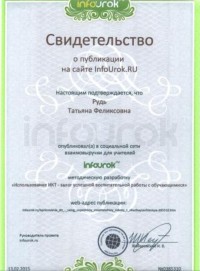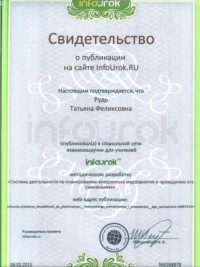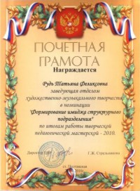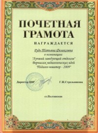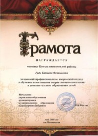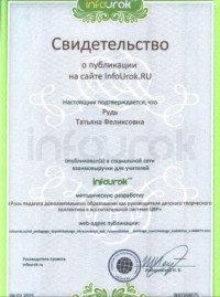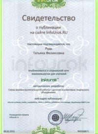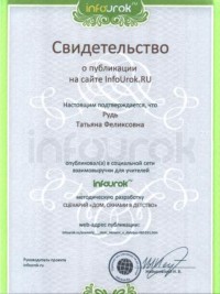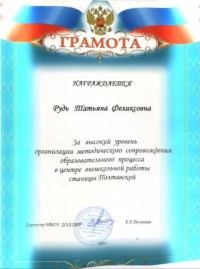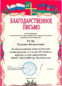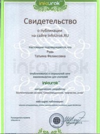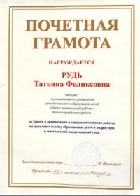Ф.И.О.: Рудь Татьяна Феликсовна. Должность: воспитатель. Образование: Армавирский государственный педагогический институт. Специальность по диплому: учитель начальных классов, по специальности «Педагогика и методика начального образования». Педагогический стаж: 23 года. Квалификационная категория: соответствие занимаемой должности. Тема самообразования: «Совершенствование форм и методов работы с детским колллективом». |