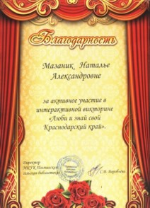 Ф.И.О.: Мазаник Наталья Александровна. Должность: воспитатель, руководитель МО воспитателей. Образование: Ярославский государственный педагогический университет имени К.Д. Ушинского. Специальность по диплому: учитель начальных классов. Педагогический стаж: 16 лет. Квалификационная категория: первая. Тема самообразования: «Формирование положительных черт характера учащихся через занятия по внеклассному чтению». |